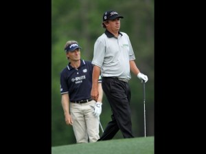 AUGUSTA, GA – APRIL 05: Jason Dufner (R) and Bernhard Langer of Germany (L) look on from the 12th tee during the first round of the 2012 Masters Tournament at Augusta National Golf Club on April 5, 2012 in Augusta, Georgia. (Photo by Jamie Squire/Getty Images)
