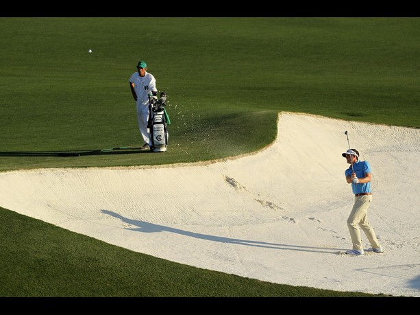AUGUSTA, GA – APRIL 06: Keegan Bradley of the United States hits a shot from a bunker on the 18th hole as caddie Steven Hale looks on during the second round of the 2012 Masters Tournament at Augusta National Golf Club on April 6, 2012 in Augusta, Georgia. (Photo by Jamie Squire/Getty Images)