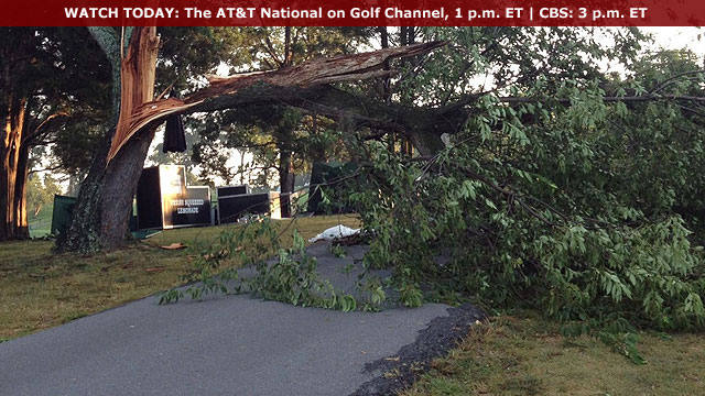 Because of a powerful storm that uprooted dozens of trees, including a 75-foot tree that crashed across the 14th fairway, the tournament was closed to spectators and volunteers because of safety concerns.